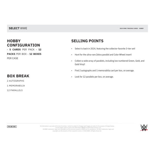 The 2024 Panini Select WWE Hobby 12 Box Case brings the electrifying energy of WWE to collectors with premium cards showcasing today’s top Superstars, WWE legends, and fan-favorite rookies. Each box includes a mix of stunning Prizm parallels, autographs, and memorabilia cards, with Select’s signature shiny finish and vibrant color variations. The 2024 Select WWE Hobby Case is perfect for any WWE fan looking to add high-impact cards to their collection.
