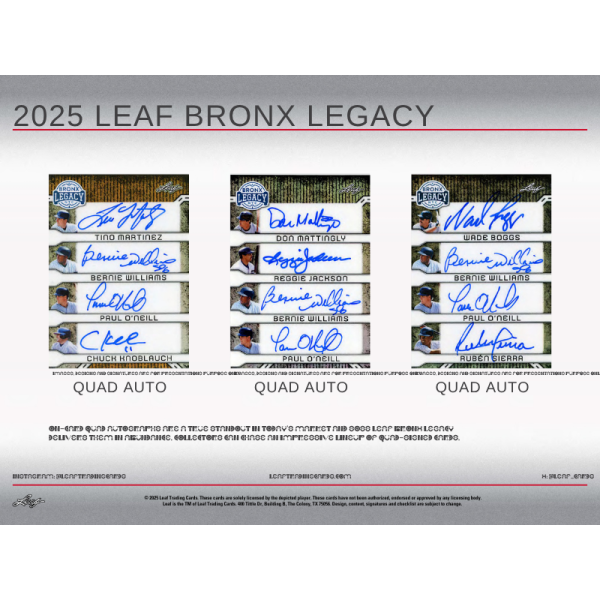 On-card quad autographs are a true standout in today’s market and 2025 Leaf Bronx Legacy delivers them in abundance. Collectors can chase an impressive lineup of quad-signed cards.